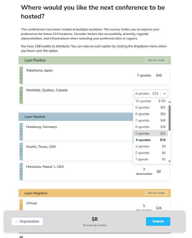 Mechanism. Each respondent receives a fixed credit budget to allocate across survey options with a quadratic cost per additional vote (1, 4, 9, 16, …). Spending heavily on one option consumes credits quickly. Individuals can express support or opposition on each option via multiple upvotes and downvotes. The survey outcome is the sum of votes across individuals.